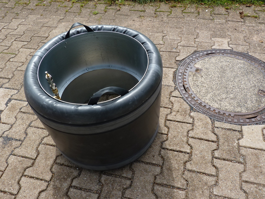 Опалубка створа для быстрого, чистого и широкомасштабного проведения затирки разрушенного люка колодца. С диаметром 640 мм для стандартного устройства створов до 630 мм от уплотнений в восстановлении люка до 100%. (По специальному заказу мы можем также поставить основу опалубка типа подушки 1-850 / с с диаметром max.850mm для больших диаметров. Даже при диаметре 800мм расход смеси очень экономичен.